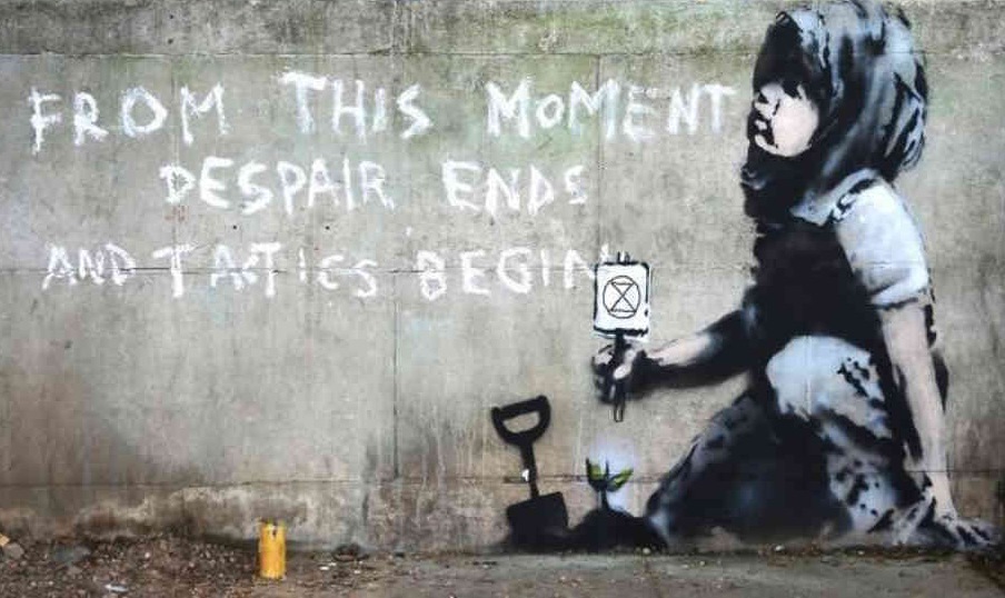 Obra atribuida a Bansky con el logotipo de Extinction Rebellion (imagen: revistaarcadia.com) ))....